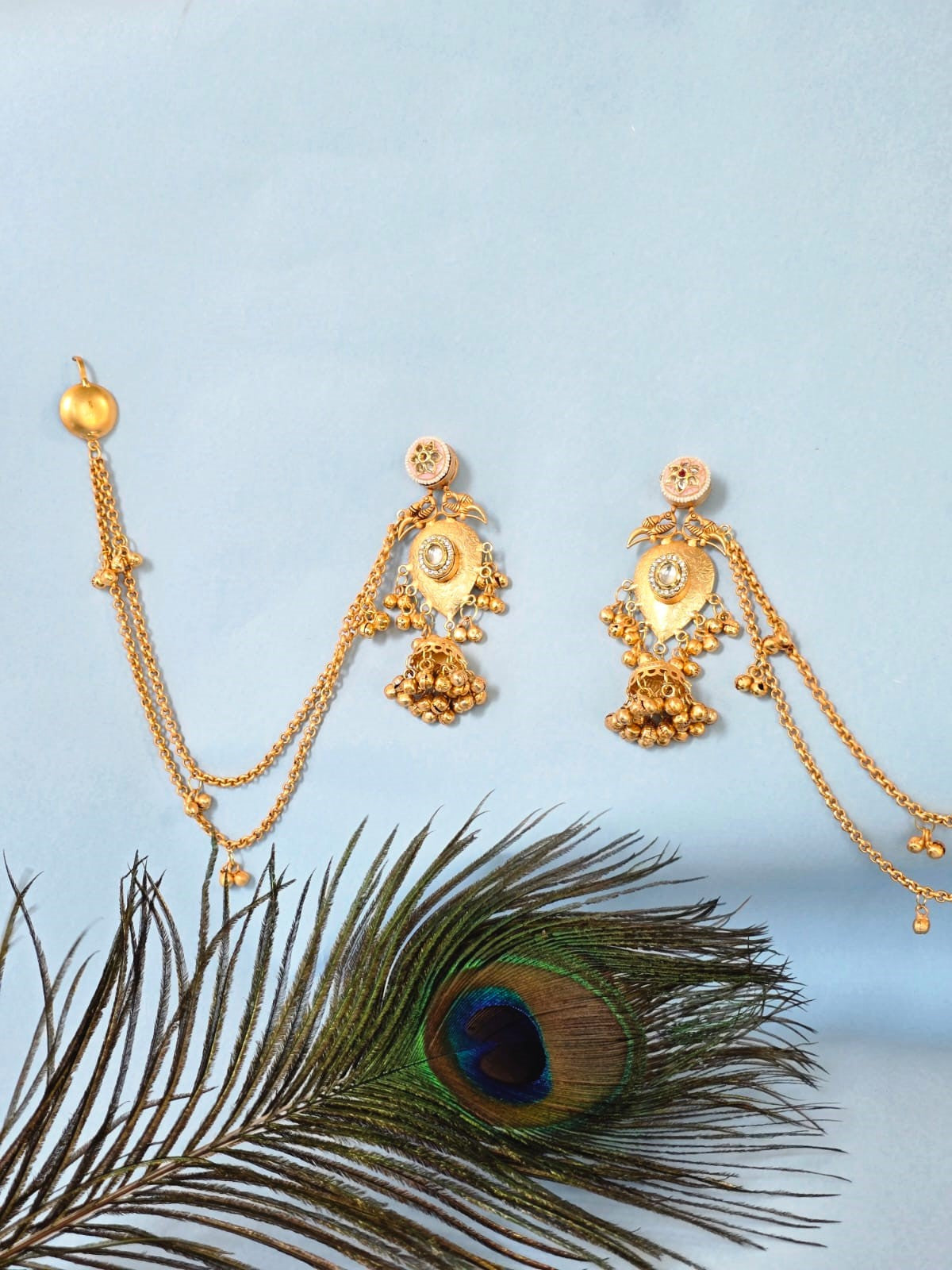 Gold Finish Kashmiri Style Jhumka Earrings with Ear Chain,Traditional Bridal Ethnic Earrings