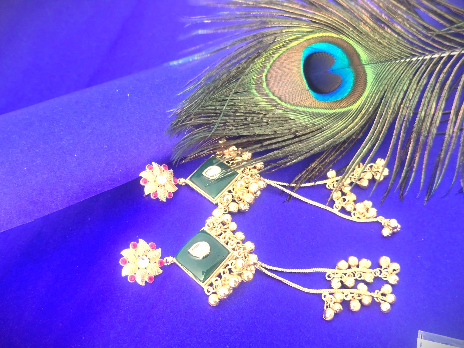 Enhance your ethnic elegance with these exquisite green enamel gold polish long dangle earrings, crafted beautifully in premium quality brass. Designed with a floral stud top, a striking green enamel centerpiece, and graceful hanging ghungroo-style drops, these earrings reflect timeless Indian craftsmanship with a royal touch.